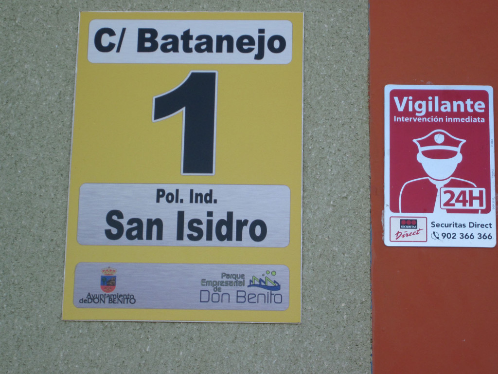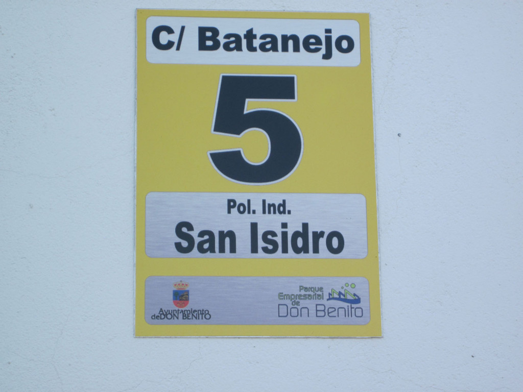 Diseñamos unas placas tamaño A4 para numerar las naves y conseguimos poner más de 100 placas identificativas con el número de gobierno. En ellas aparece el nombre de la calle, el número, el polígono industrial donde se ubica, el logotipo del Ayuntamiento y el de la Asociación Parque Empresarial de Don Benito. El color de la placa es el que se asigna al sector al cual pertenecen.